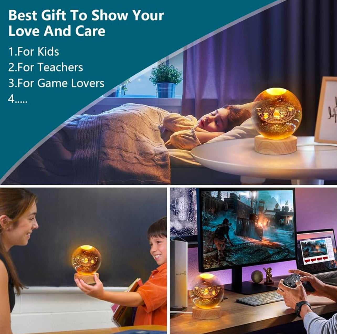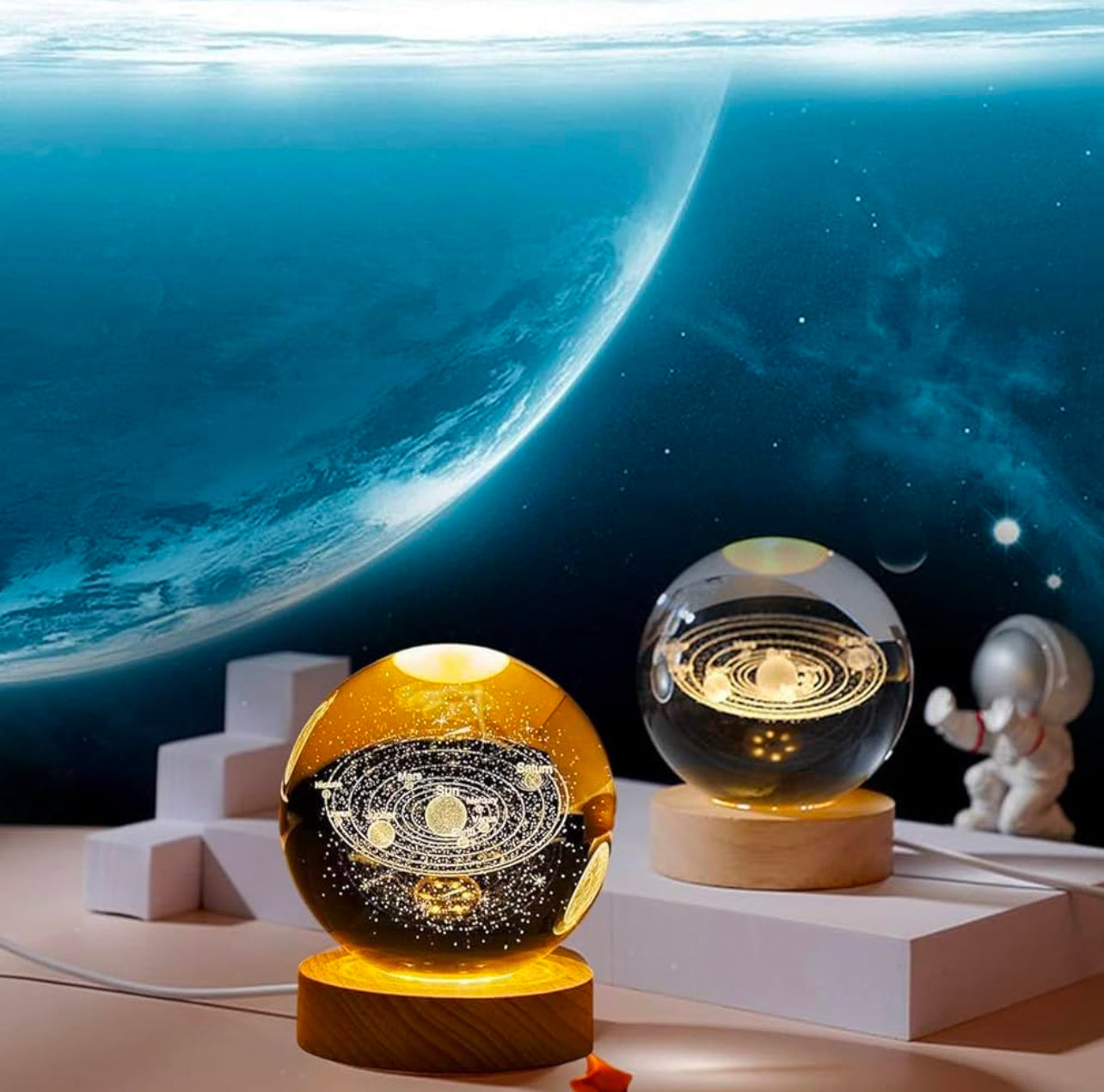 3D Crystal Galaxy Ball Night Lamp with Wooden Base (6cm) - Solar System - Moon - Earth - Heart Cloud - Crescent -Moon Walk