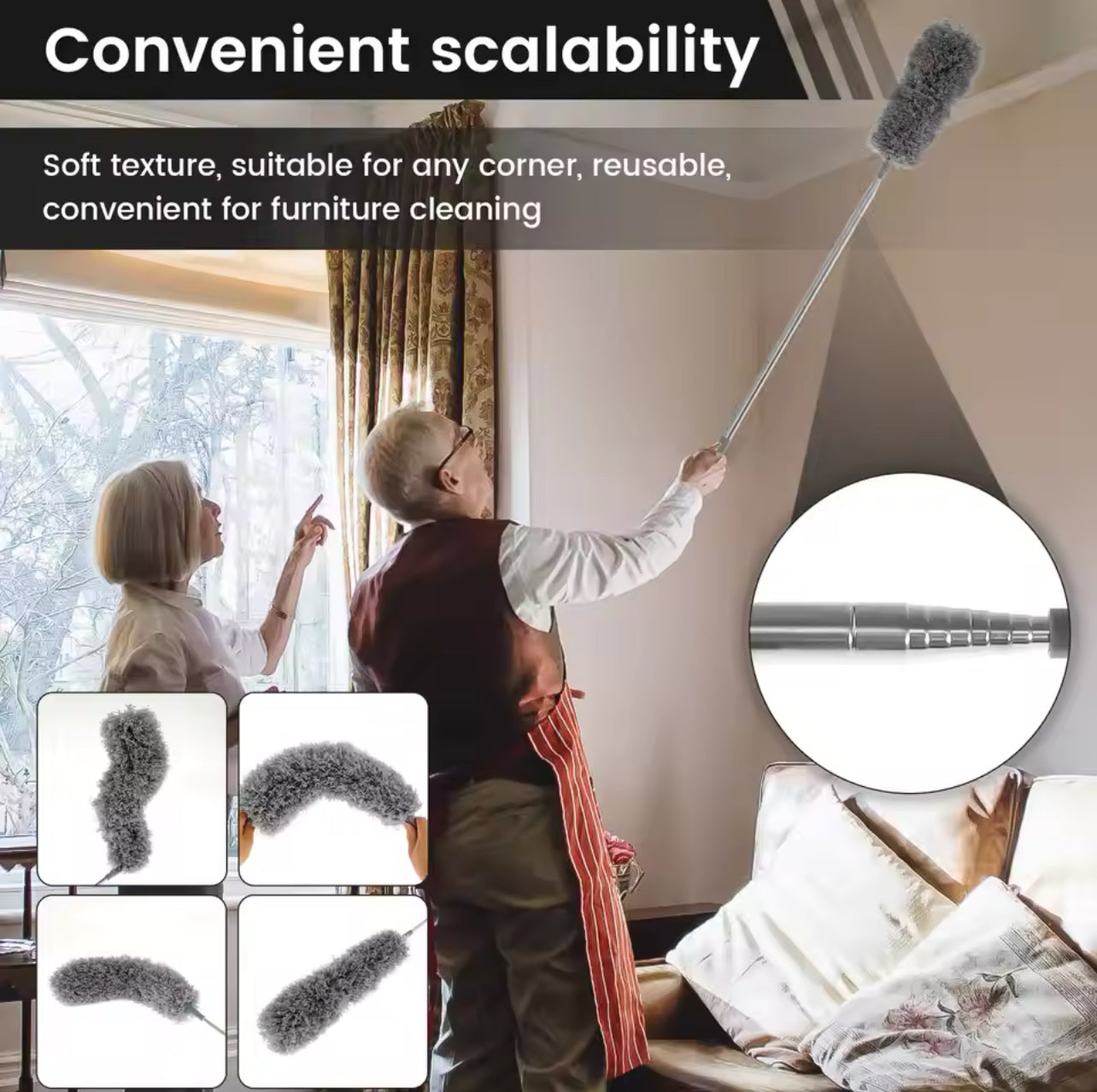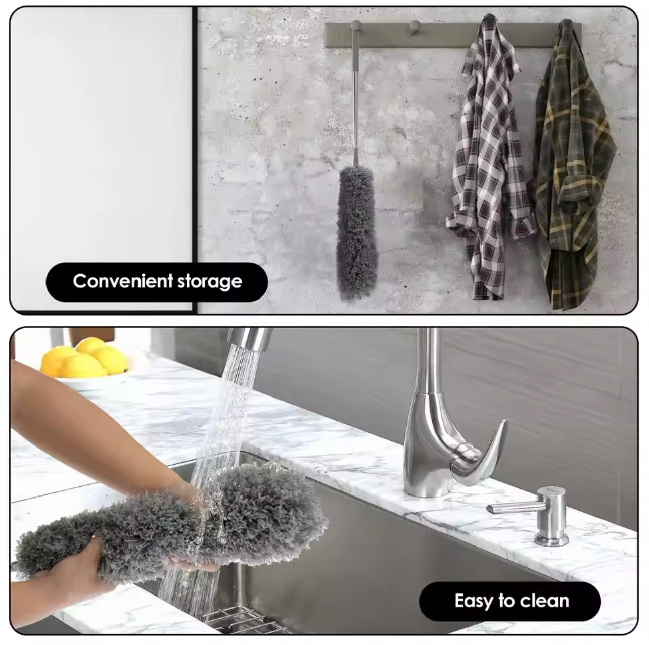 let the microfiber be fluffy. Place in ventilated place to dry. We have also designed the base of the extending rod with a hanging hole to make storage