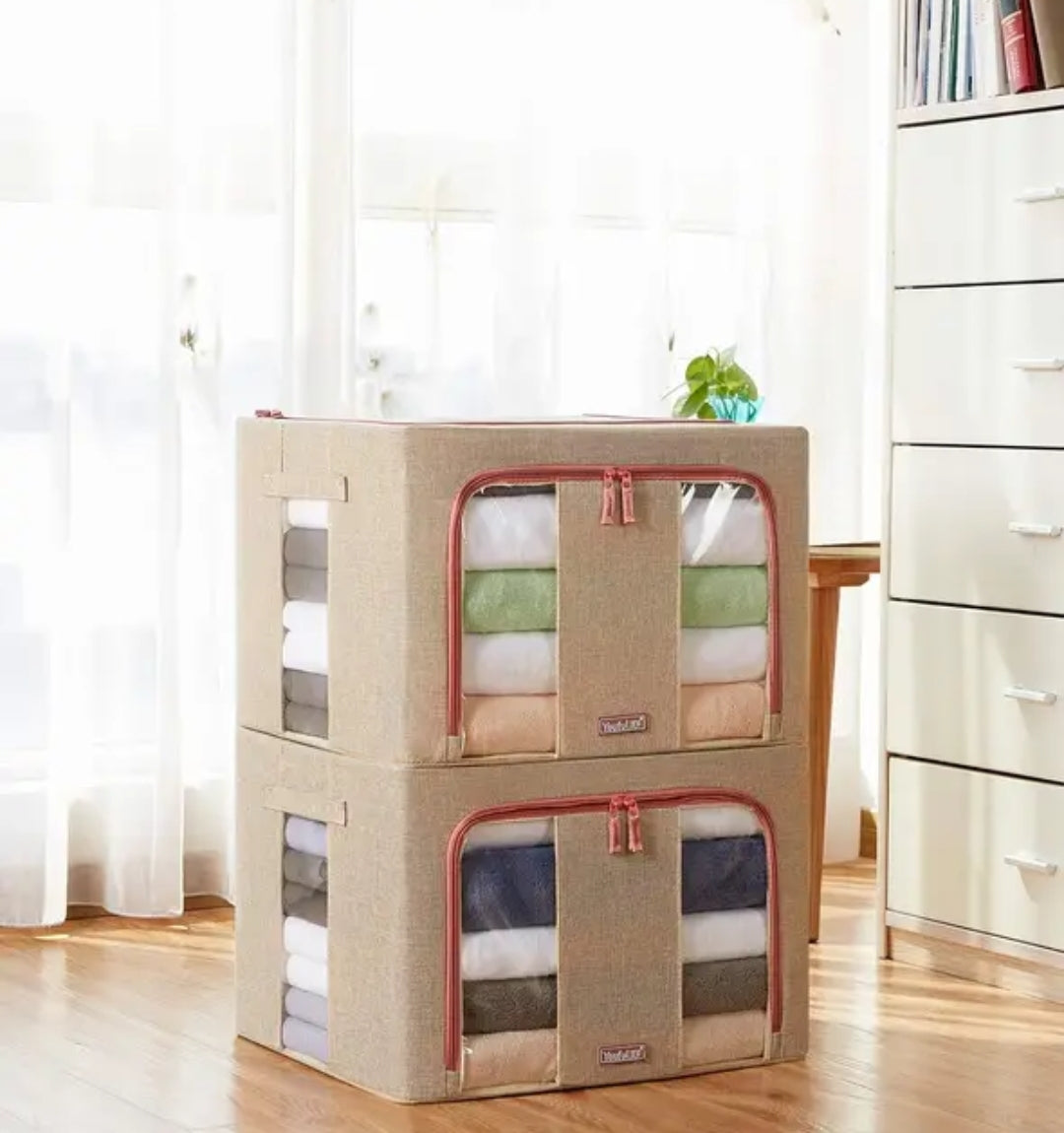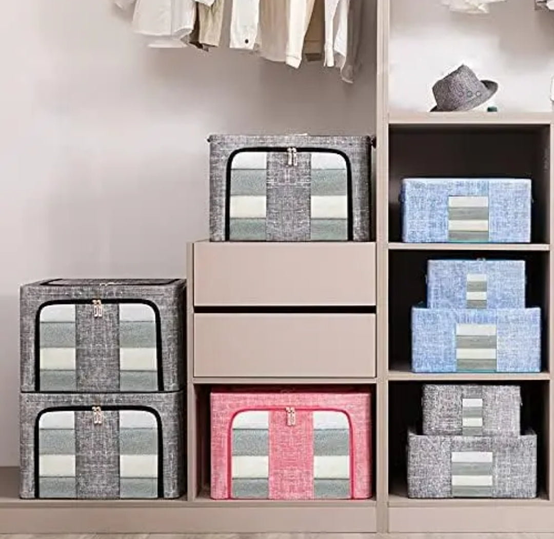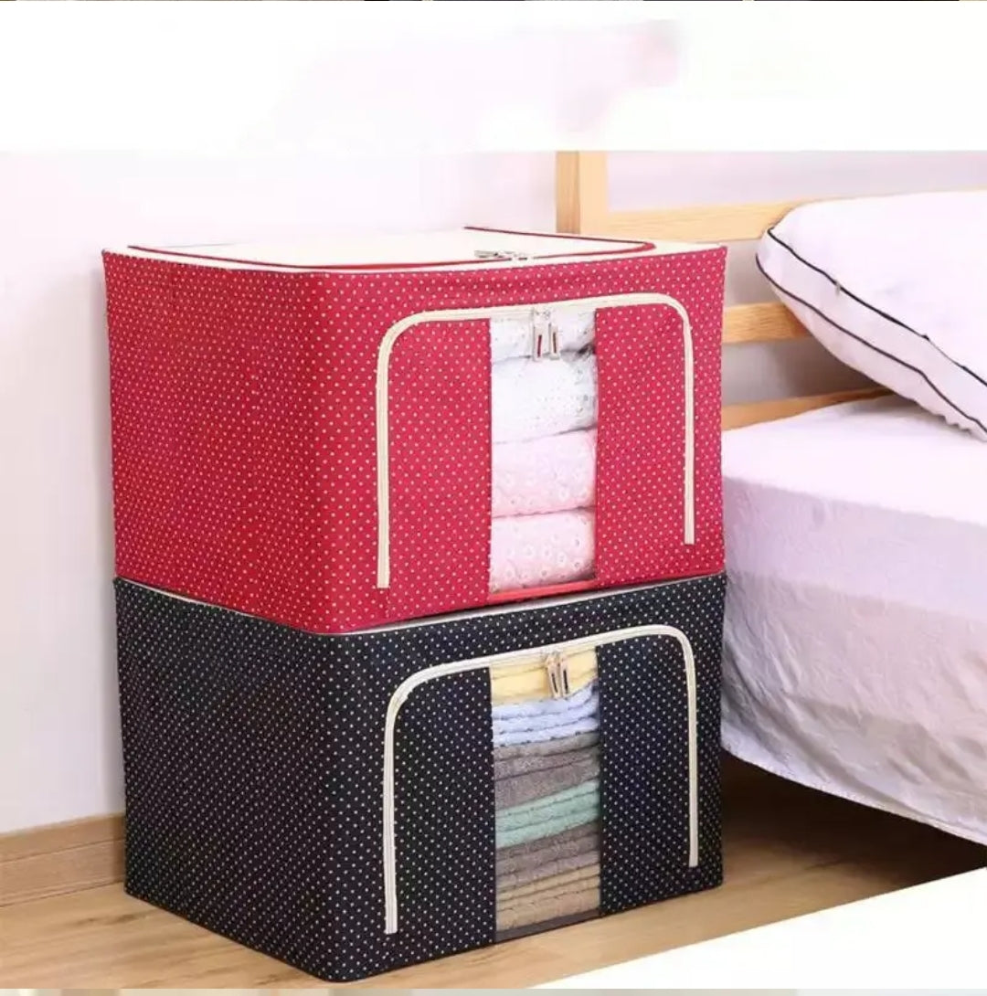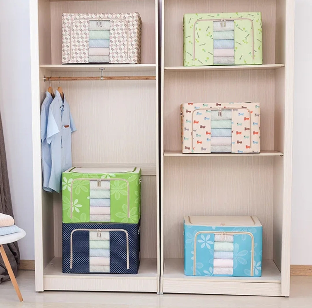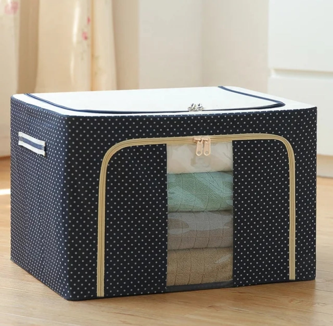Blanket, dress, and multiple item storage box foldable storage bag with iron rod.